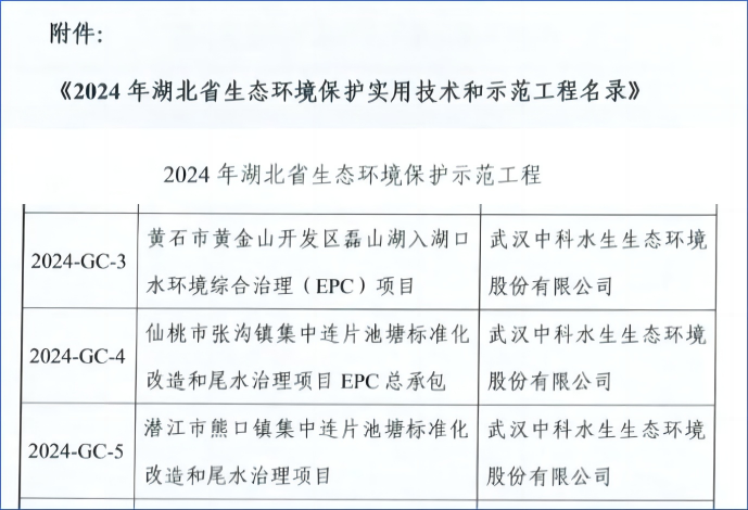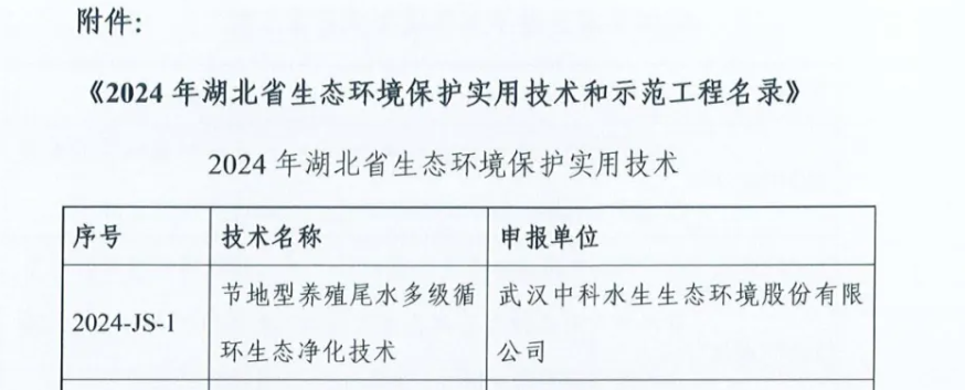 近日,湖北省环保产业协会公布了《2024年湖北省生态环境保护实用技术和示范工程名录》,武汉中科水生申报的“节地型养殖尾水多级循环处理技术”、黄石市黄金山开发区磊山湖入湖口水环境综合治理(EPC)项目、潜江市熊口镇集中连片池塘标准化改造和尾水治理项目、仙桃市张沟镇集中连片池塘标准化改造和尾水治理项目EPC总承包成功入选该示范工程名录。