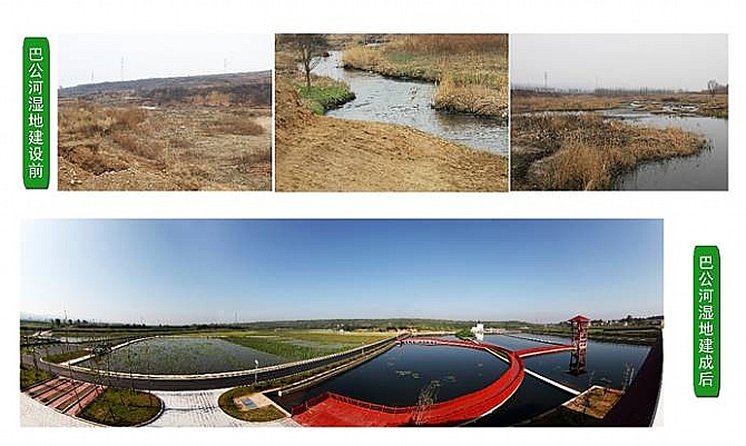 我公司承建的晋城市巴公河人工湿地(2014-2015设计施工总承包、运营)处理对象为巴公河受污染河水,处理规模按3万m3/d设计实施;建设内容包括:积水缓冲池、进水格栅渠、沉淀池、表面流人工湿地、垂直流人工湿地、出水泵房、储泥池、污泥浓缩脱水车间、监测室、防洪挡墙、大门围墙、道路、景观及其它附属配套设施等。本工程实施后,可为丹河龙门湿地公园提供3万m3/d的生态景观用水。