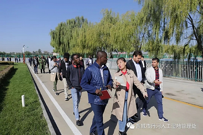 2018年10月10日上午,亚太及非洲地区等40多个国家记者团一行百余人深入丹河人工湿地,实地考察了中国最大的垂直流人工湿地。市环保局副局长李维民、丹河人工湿地管理处主任李四团、副主任崔宾飞陪同。记者团在听取了工作人员讲解后,深入丹河人工湿地进行察看,详细了解工艺细节及处理流程,不时通过翻译向工作人员提问人工湿地运行管理方式及水质净化等情况,对湿地的运行管理表现出极大兴趣。
