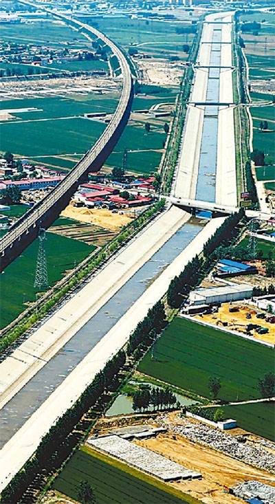 南水北调中线总干渠石家庄段(右)与京石高铁“并肩而行”。