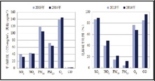 16个城市空气质量年均值达标,145个城市空气质量超标 2014年新标准第一阶段监测实施城市平均浓度和达标城市比例年际比较 2014年全国省界断面水质状况 2013年全国县域生态环境质量分布示意图 环境保护部今日向媒体通报了《2014中国环境状况公报》。公报指出,2014年,在党中央、国务院的高度重视下,生态文明建设和生态环境领域改革取得积极进展,大气、水、土壤污染防治迈出新步伐,主要污染物总量减排年度任务顺利完成,环境保护优化发展的综合作用继续显