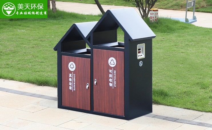 - 說明: 這款垃圾桶桶身及頂蓋采用電解鍍鋅鋼板為基材,防腐性能高于普通冷軋鋼板。桶頂蓋采用仿屋檐設計更具特色,門板仿木紋UV打印更顯質感。